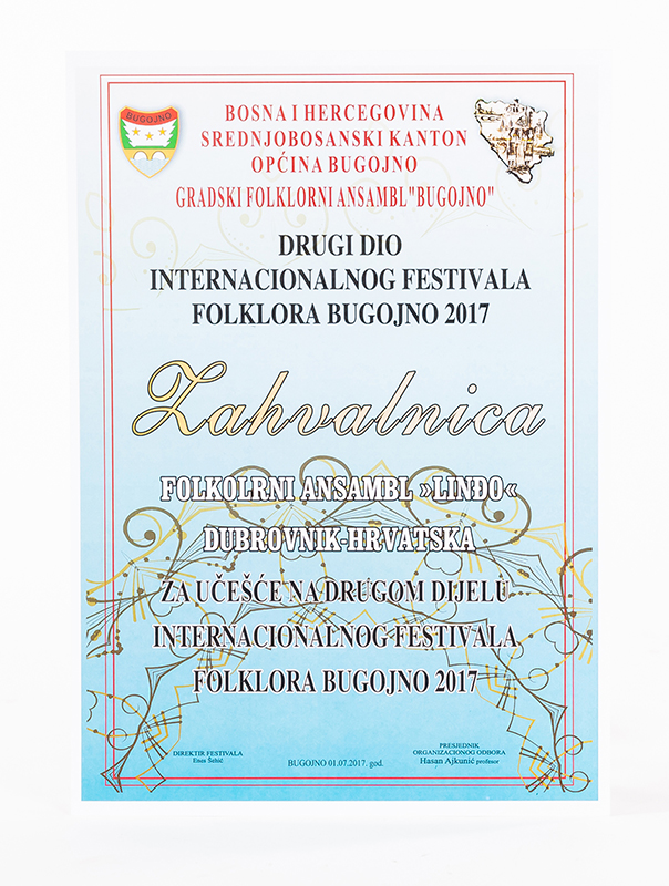 FAL M 75, Zahvalnica za sudjelovanju na Internacionalnom festivalu folklora u Bugojnu, 2017