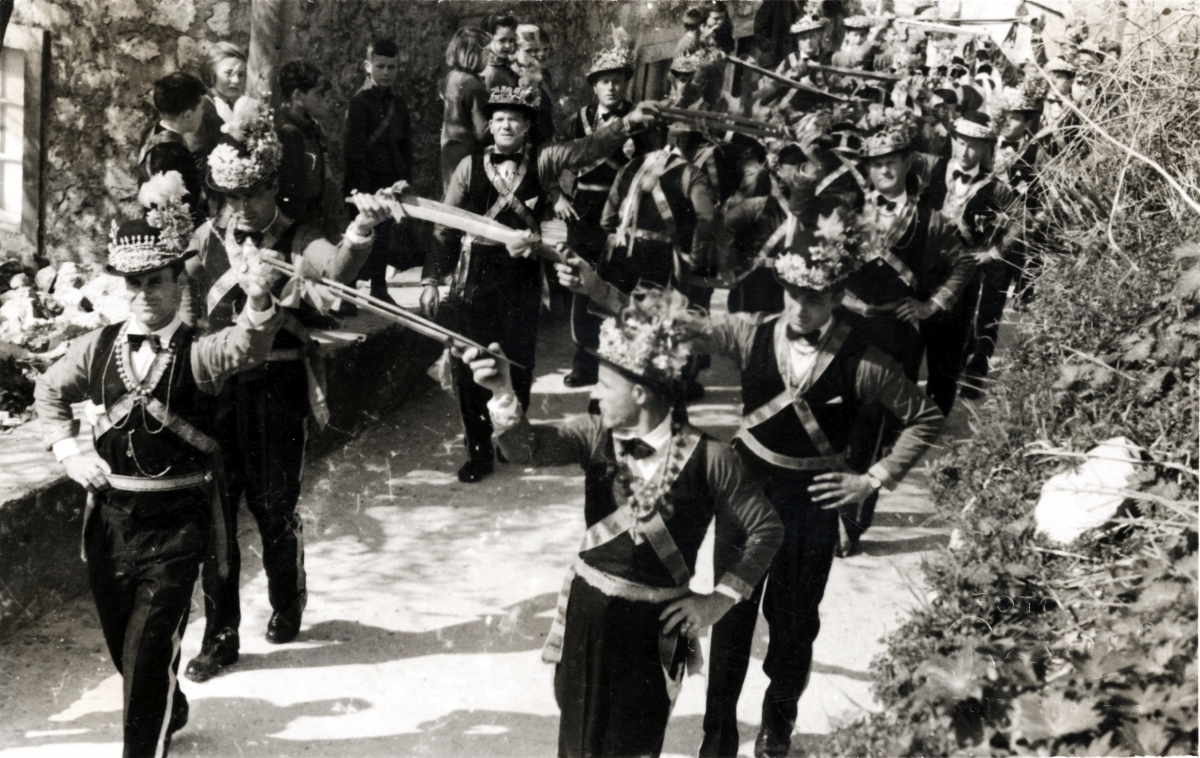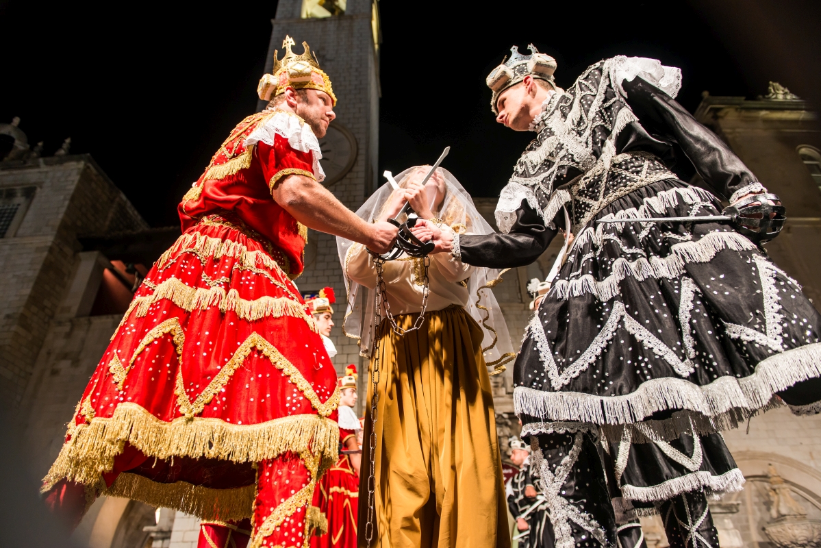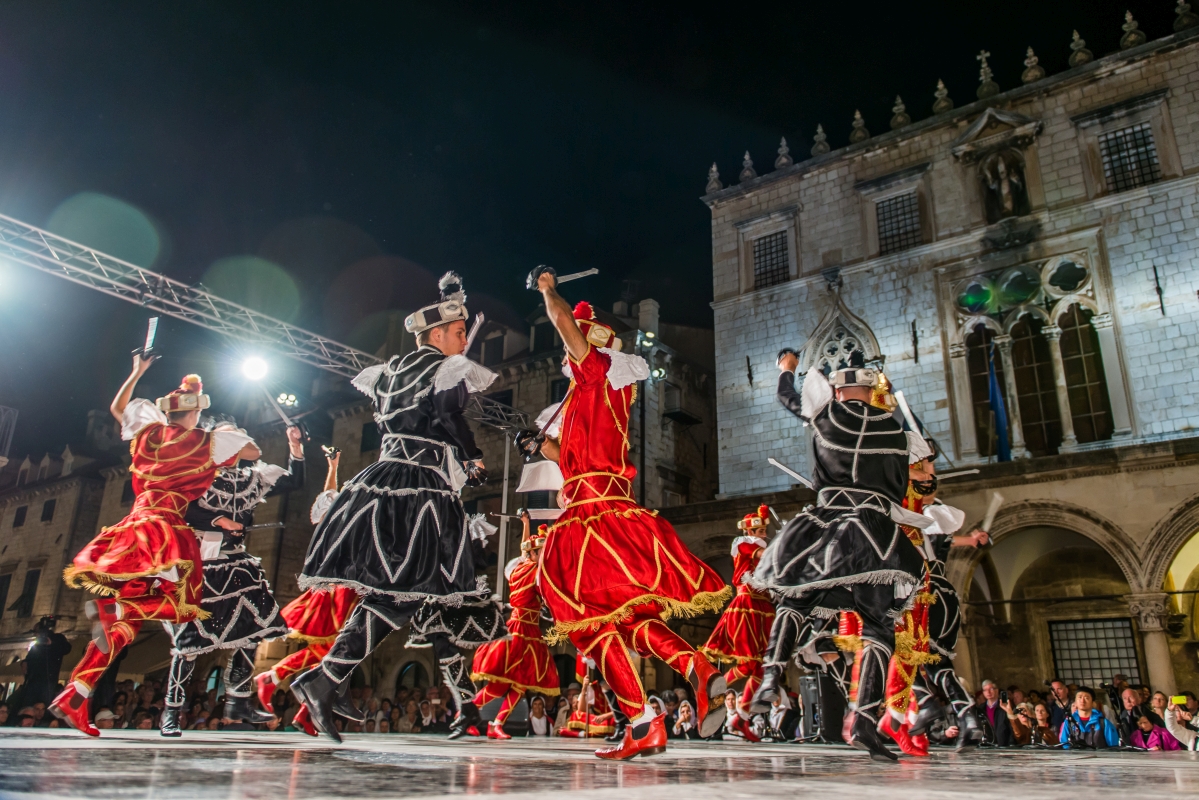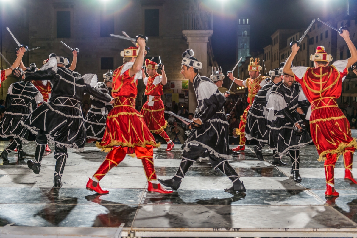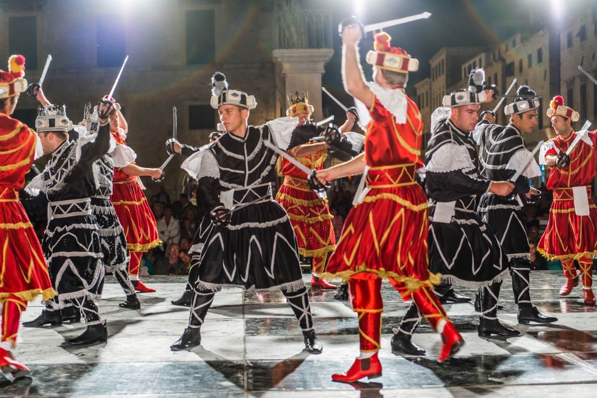 Tradicijska kultura Dubrovnika i okolice>Plesna i glazbena baština >Mačevni plesovi u Dubrovniku i Dalmaciji Mačevni plesovi u Dubrovniku i Dalmaciji U Dubrovniku i Dalmaciji od 15. do 18. stoljeća moreška i cerchiata pojavljuju se kao borba sukobljenih likova, bojna igra s plesom ili kao lančani ples u sklopu različitih dramskih uprizorenja. U tom kontekstu izvedbe nositelj cjelokupne predstave je dramska radnja, a borba i ples tek su popratni dio. S druge strane, moreška i cerchiata pojavljuju se i u svojem užem značenju kao stilizirani prikaz borbe, odnosno bojni ples – ples od boja dvaju nasuprotnih vojski, u kojem je dramaturški dio stavljen u funkciju ritualnog sukoba, bojnog plesa, i time mu je podređen. R. Wolfram, kada govori o mačevnim plesovima i plesovima s obručima okićenima zelenilom i cvijećem – cerchiatama, koje u Austriji izvode muška društva, navodi da su pokreti, odnosno figure kod oba plesa jednake, napominjući da je ples s lukovima nešto kasnija izvedenica onoga s mačevima.